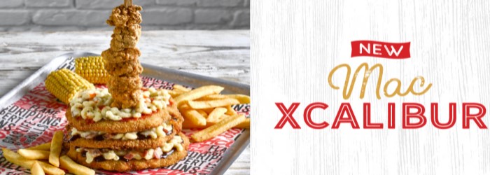– There is a chicken challenge, named the “Macxcalibur Challenge,” where customers must eat 3 chicken schnitzels; two topped with smoked bacon mac ’n’ cheese and drizzled with Texan-style BBQ sauce, one topped with jalapeño mac ’n’ cheese and piri piri, and skewered with a southern fried chicken skewer. It is served with a large portion of chips and 2 corn on the cobs.