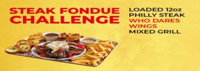 – There is a steak challenge, named the “Steak Fondue” Challenge, where customers must eat 32oz steak sliced ready to dip into a whole melted Camembert cheese. It is served with roasted peppers, onions, garlic ciabatta, chips and cheese-filled potato skins with peppercorn sauce and gravy.