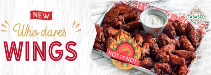 – There is a wing challenge, named the “Who Dares Wing” Challenge, where customers must eat 25 wings with a sour cream dip, 5 tossed in each flavor: Piri Piri, Sweet Chilli, Spicy Dry Rub, Texas-style BBQ, and TABASCO® Scorpion Sauce.