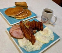 – Four eggs any style, hash browns, 4 bacon slices, 4 sausage links, 1 slice of ham, and 3 pancakes with toast.