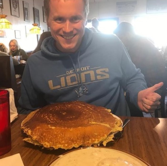 Apparently, this pancake challenge is not listed on Sparty’s menu or well advertised, but you can ask your served about it and he or she will know about it. You get 3 platter-sized pancakes and you must finish them in 1 hour or less. Winners get the $7 meal free and a sweet t-shirt.