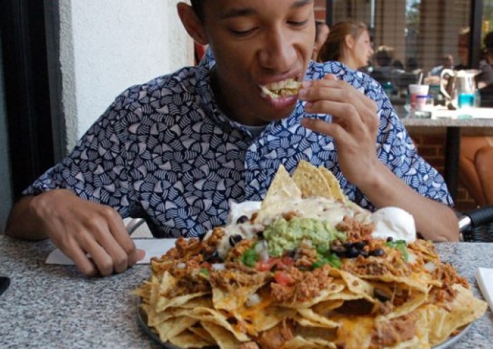 – 5 pounds of nachos covered in beef, chicken, beans, cheddar and jack cheeses, tomatoes, green peppers, black olives, lettuce, onions, sour cream and guacamole. There is a 45-minute time limit for this challenge.