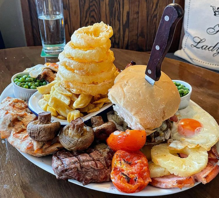 – Hungry diners have a one sitting time limit to finish an English pub classic mixed grill platter loaded with rump steak, pork chops, gammon, fried eggs, black pudding, sausages, a double bacon cheeseburger, roasted tomatoes, pineapple, peas, mushrooms, chips, and onion rings.