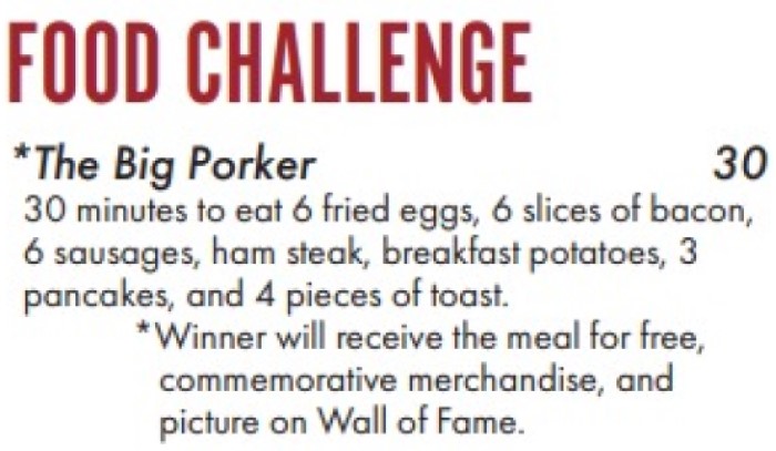 – This “Big Porker” Breakfast Challenge has 30 minute time limit to finish everything on the platter.