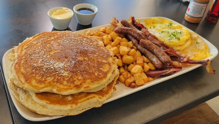 – There are 3 giant pancakes with 6 pork sausages, 6 strips of pork bacon, and 1 big ham steak.